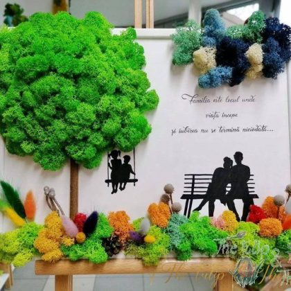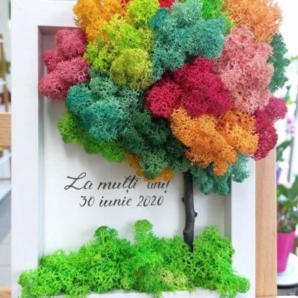 Lichenii stabilizați, folosiți în realizarea acestor tablouri, sunt tratați profesional pentru a-și păstra prospețimea și culoarea, oferind o durabilitate remarcabilă. Alegerea culorilor și a designurilor îți permite să creezi un decor adaptat stilului tău, fie că preferi nuanțe naturale, fie accente vibrante.
